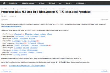 Diberitahukan kepada mahasiswa Undip yang sudah mendaftar Program KKN Undip Tim II TA 2017/2018 bahwa lokasi penempatan mahasiswa KKN dapat dilihat pada laman: http://regkkn.lppm.undip.ac.id