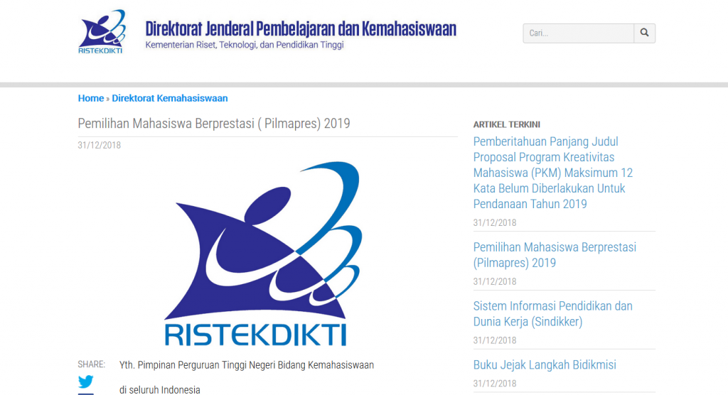 Yth. Pimpinan Perguruan Tinggi Negeri Bidang Kemahasiswaan di seluruh Indonesia Direktorat Kemahasiswaan, Direktorat Jenderal Pembelajaran dan Kemahasiswaan, Kemristekdikti kembali akan melaksanakan Pemilihan Mahasiswa Berprestasi (Pilmapres) Tahun 2019 yang terdiri atas 2 (dua) Kategori yaitu Program Sarjana dan Program Diploma. Sehubungan dengan hal tersebut, mohon Saudara untuk segera melaksanakan kegiatan ini. Adapun tahapan seleksi terdiri atas […]