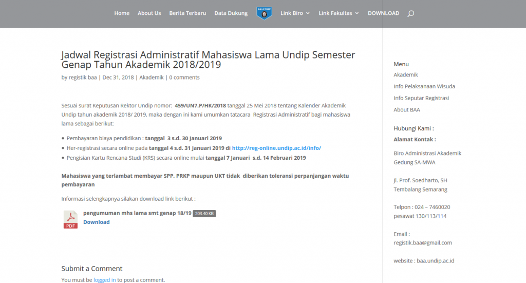Jadwal Registrasi Administratif Mahasiswa Lama Undip Semester Genap Tahun Akademik 2018/2019