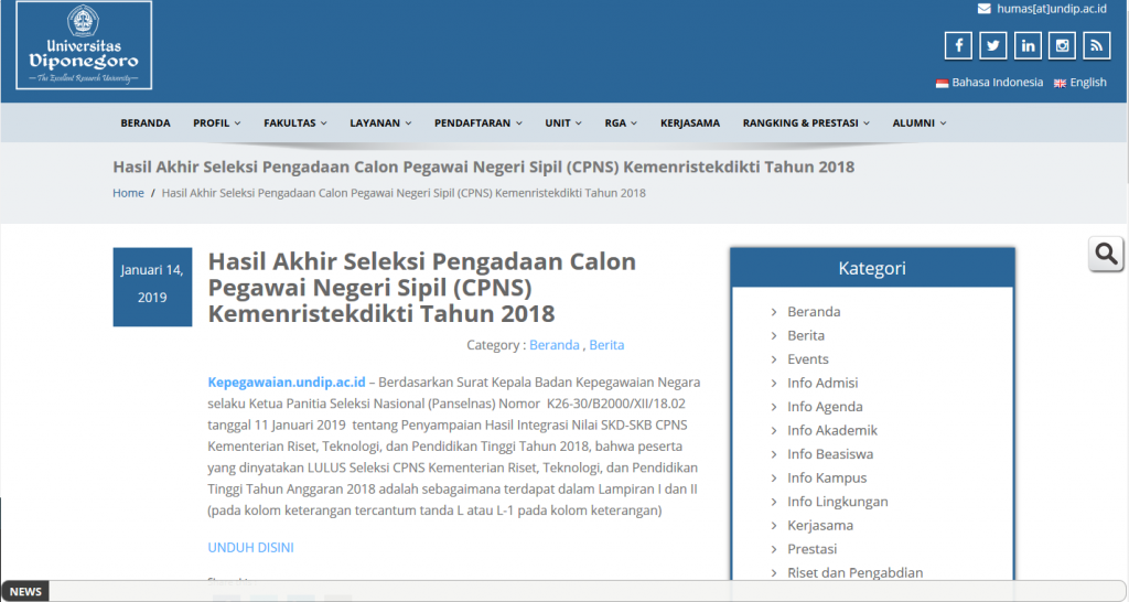 Kepegawaian.undip.ac.id – Berdasarkan Surat Kepala Badan Kepegawaian Negara selaku Ketua Panitia Seleksi Nasional (Panselnas) Nomor K26-30/B2000/XII/18.02 tanggal 11 Januari 2019 tentang Penyampaian Hasil Integrasi Nilai SKD-SKB CPNS Kementerian Riset, Teknologi, dan Pendidikan Tinggi Tahun 2018, bahwa peserta yang dinyatakan LULUS Seleksi CPNS Kementerian Riset, Teknologi, dan Pendidikan Tinggi Tahun Anggaran 2018 adalah sebagaimana terdapat dalam Lampiran […]