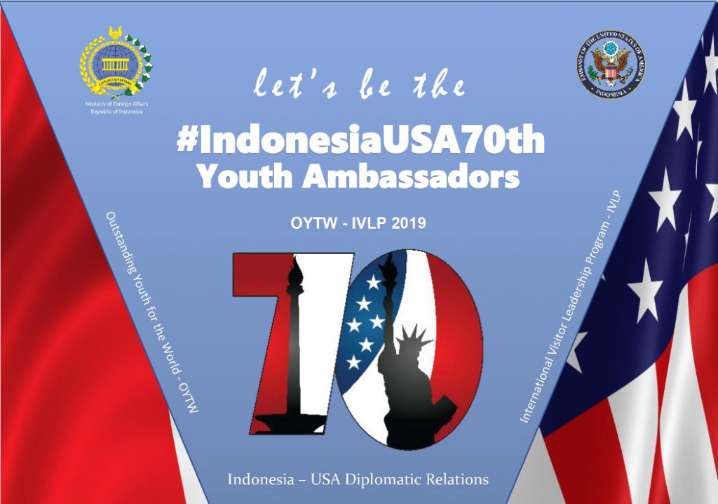 #IndonesiaUSA70th Youth Ambassadors Peringatan 70 Tahun Hubungan Diplomatik antara Republik Indonesia dengan Amerika Serikat Apa itu #IndonesiaUSA70th Youth Ambassadors? #IndonesiaUSA70th Youth Ambassadors adalah program kolaborasi antara Outstanding Youth for the World (OYTW) dari Pemerintah Indonesia dan International Visitor Leadership Program (IVLP) dari Pemerintah Amerika Serikat. OYTW telah diselenggarakan oleh Kementerian Luar Negeri sejak tahun 2011, dengan mengirimkan para pemuda pemudi Indonesia […]