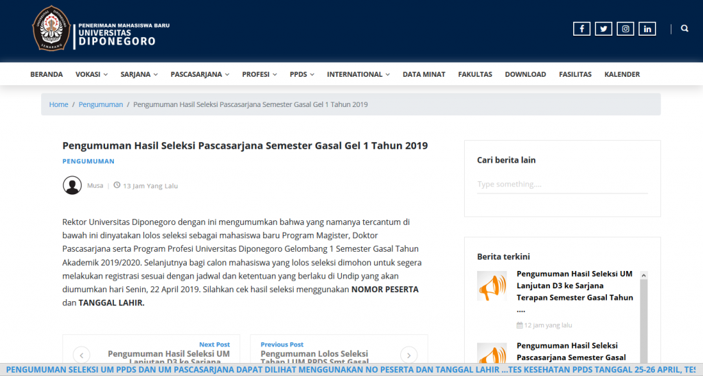 Rektor Universitas Diponegoro dengan ini mengumumkan bahwa yang namanya tercantum di bawah ini dinyatakan lolos seleksi sebagai mahasiswa baru Program Magister, Doktor Pascasarjana serta Program Profesi Universitas Diponegoro Gelombang 1 Semester Gasal Tahun Akademik 2019/2020. Selanjutnya bagi calon mahasiswa yang lolos seleksi dimohon untuk segera melakukan registrasi sesuai dengan jadwal dan ketentuan yang berlaku di […]