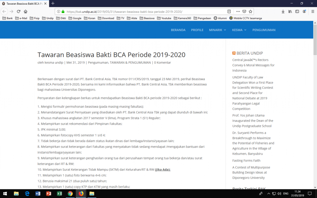 Berkenaan dengan surat dari PT. Bank Central Asia, Tbk nomor 011/CRS/2019, tanggal 23 Mei 2019, perihal Beasiswa Bakti BCA Periode 2019-2020, bersama ini kami informasikan bahwa PT. Bank Central Asia, Tbk memberikan beasiswa bagi mahasiswa Universitas Diponegoro. Persyaratan dan kelengkapan berkas untuk mendapatkan Beasiswa Bakti BCA periode 2019-2020 sebagai berikut : Mengisi formulir permohonan beasiswa […]