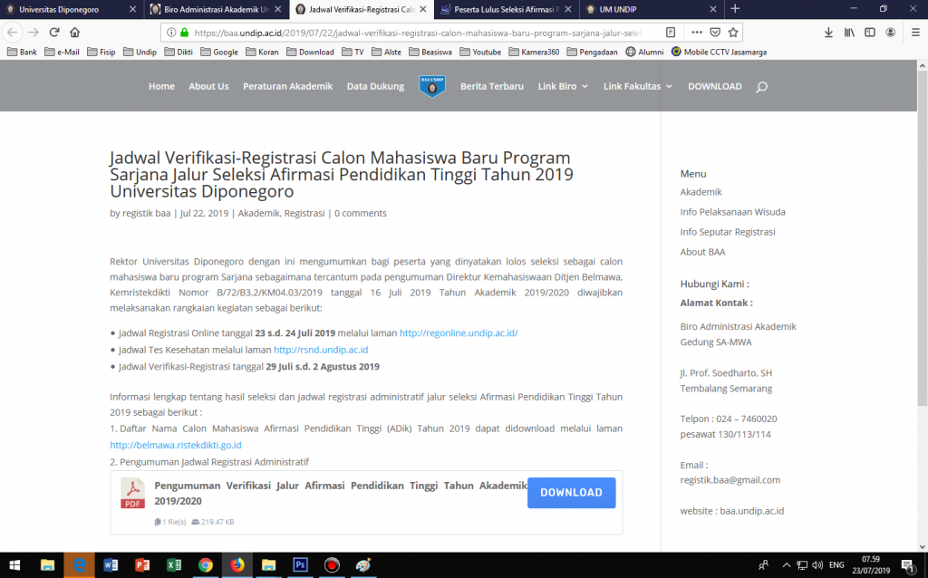 Jadwal Verifikasi-Registrasi Calon Mahasiswa Baru Program Sarjana Jalur Seleksi Afirmasi Pendidikan Tinggi Tahun 2019 Universitas Diponegoro