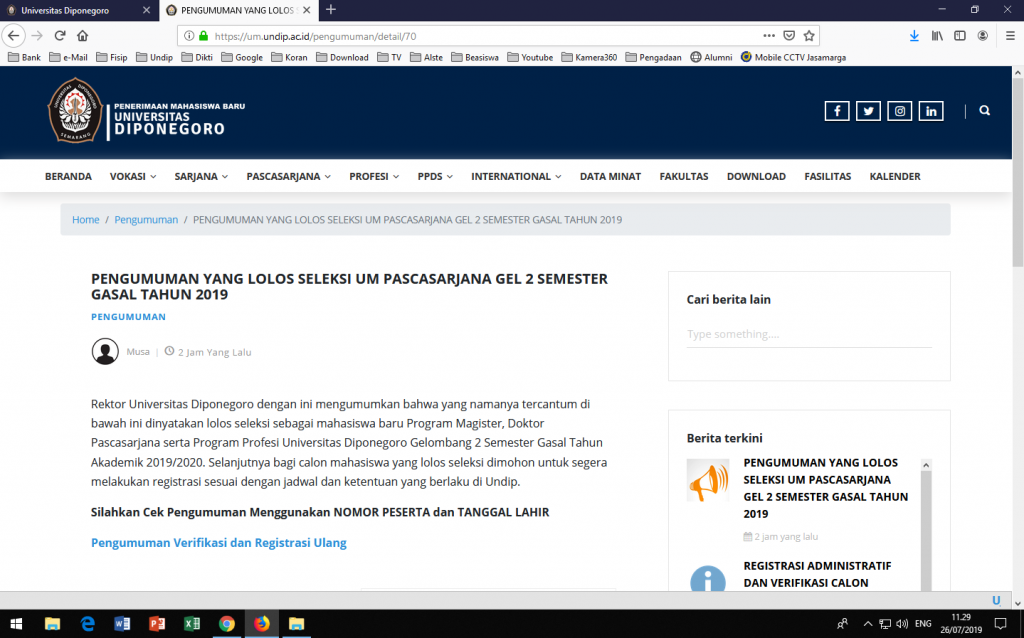 Rektor Universitas Diponegoro dengan ini mengumumkan bahwa yang namanya tercantum di bawah ini dinyatakan lolos seleksi sebagai mahasiswa baru Program Magister, Doktor Pascasarjana serta Program Profesi Universitas Diponegoro Gelombang 2 Semester Gasal Tahun Akademik 2019/2020. Selanjutnya bagi calon mahasiswa yang lolos seleksi dimohon untuk segera melakukan registrasi sesuai dengan jadwal dan ketentuan yang berlaku di […]