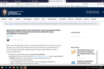- Melaksanakan registrasi secara online di https://regonline.undip.ac.id/pada tanggal 29 s.d 31 Juli 2019 melalui laman https://regonline.undip.ac.id/dengan ketentuan: