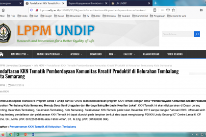 Diberitahukan kepada Mahasiswa Program Strata 1 Undip bahwa P2KKN akan melaksanakan program KKN Tematik dengan tema “Pemberdayaan Komunitas Kreatif Produktif Kelurahan Tembalang Kota Semarang Menuju Desa Seni Unggulan dan Berdaya Saing Berbasis Kearifan Lokal“. KKN Tematik ini akan dilaksanakan di Dusun Jurang Belimbing, Kelurahan Tembalang, Kecamatan Tembalang, Kota Semarang. Pelaksanaan KKN Tematik pada bulan Desember 2019 sampai dengan Februari 2020. Informasi lebih lengkap tentang pendaftaran dan pelaksanaan KKN Tematik ini dapat diunduh pada lampiran berikut atau dapat menghubungi P2KKN Undip Gedung ICT Centre Lantai 6. CP. Triyono, SH., M.Kn. (WA: 081225551816) atau Fahmi Arifan, ST., M.Eng. (WA: 081328308 984).