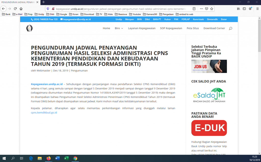 Kepegawaian.undip.ac.id – Sehubungan dengan perpanjangan masa pendaftaran Seleksi CPNS Kemendikbud (Dikti) selama 4 hari, yang semula sampai dengan tanggal 5 Desember 2019 menjadi sampai dengan tanggal 9 Desember 2019 (sebagaimana diumumkan melalui Pengumuman Nomor 141000/A.A3/KP/2019 tanggal 5 Desember 2019) maka dengan ini disampaikan bahwa Pengumuman Hasil Seleksi Administrasi Penerimaan CPNS Kemendikbud Tahun 2019 (termasuk Formasi […]