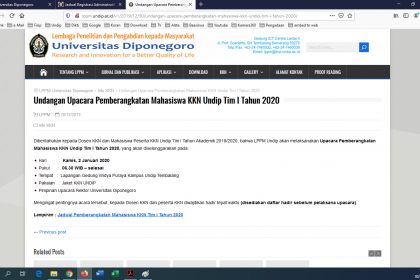 Diberitahukan kepada Dosen KKN dan Mahasiswa Peserta KKN Undip Tim I Tahun Akademik 2019/2020, bahwa LPPM Undip akan melaksanakan Upacara Pemberangkatan Mahasiswa KKN Undip Tim I Tahun 2020, yang akan diselenggarakan pada:
