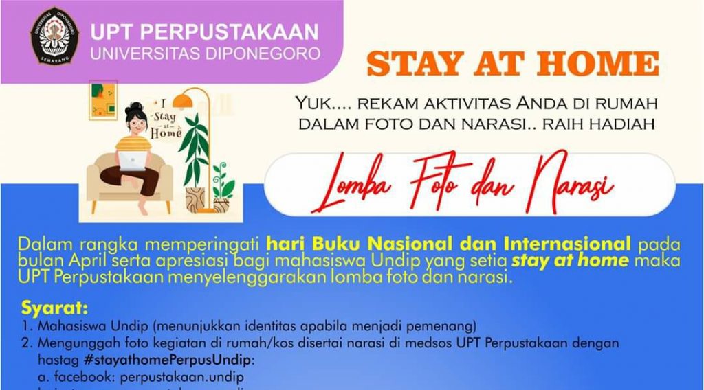 Dalam rangka memperingati hari Buku Nasional dan Internasional pada bulan April serta apresiasi bagi mahasiswa Undip yang setia stay at home maka UPT Perpustakaan menyelenggarakan lomba foto dan narasi. Syarat: Mahasiswa Undip (menunjukkan identitas apabila menjadi pemenang) Mengunggah foto kegiatan di rumah/kos disertai narasi di medsos UPT Perpustakaan dengan hastag #stayathomePerpusUndip: facebook: perpustakaan.undip (https://www.facebook.com/perpustakaan.undip.3) instagram: […]