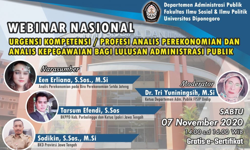 Webinar Nasional Dep. Administrasi Publik FISIP-UNDIP : Urgensi Kompetensi/Profesi Analis Perekonomian Dan Analis Kepegawaian Bagi Lulusan Administrasi Publik