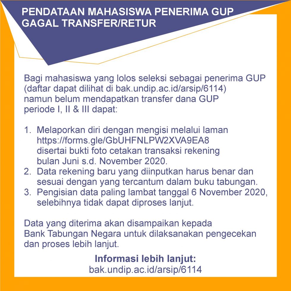 The Undip Care Movement (GUP) has been launched in order to help students of Universitas Diponegoro who are affected by the COVID-19. The GUP has selected 1712 students who either have enrolled themselves or are eligible for the assistance. The process of transferring the GUP funds to the students’ accounts has been carried out as follows: