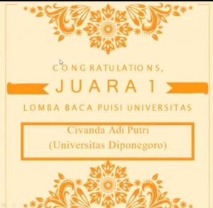 Civanda Adi Putri, a student of the Government Science Study Program at Universitas Diponegoro, as well as a member of the Diponegoro Theater, had won first place in the Poetry Reading Contest organized by the Aksara Event Organizer, Office Administration Education Study Program, Faculty of Economics, Universitas Negeri Yogyakarta.