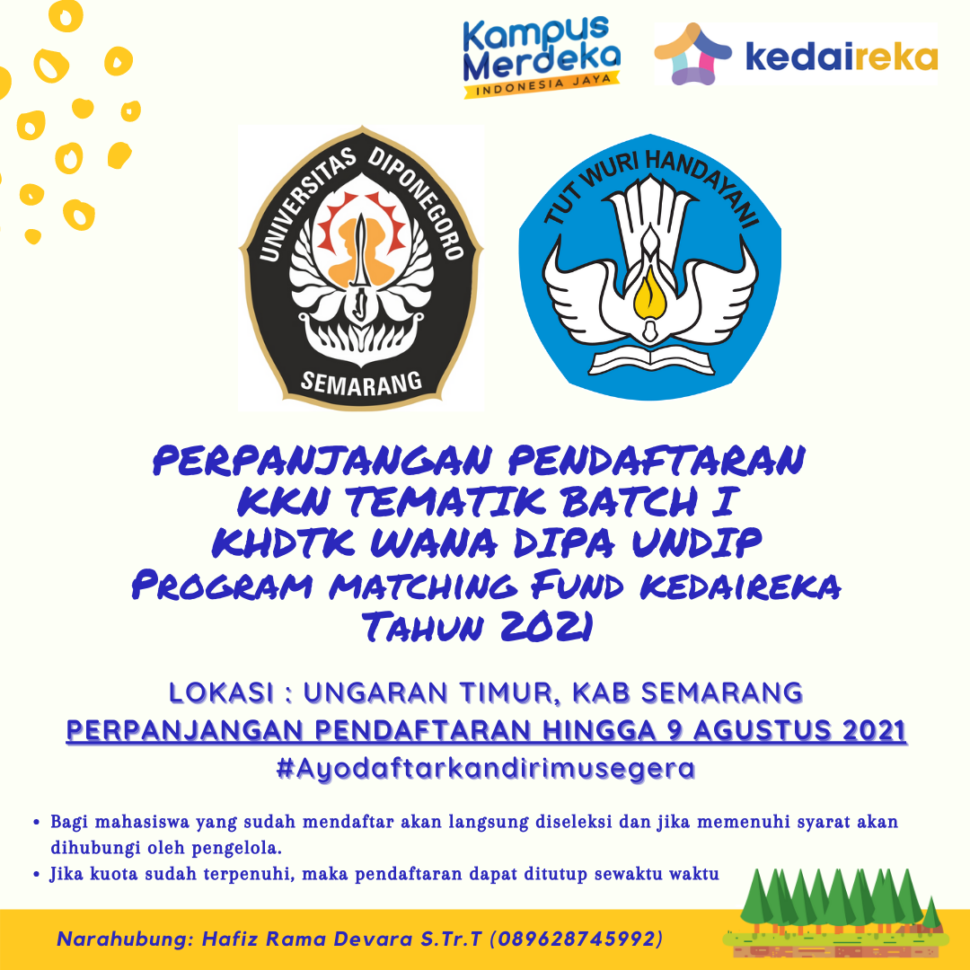 In order to provide wider opportunities for Universitas Diponegoro’s students to take part in the Batch I KKN Wana Dipa Undip – Kedaireka Ministry of Education, Culture, Research, and Technology’s Thematic KKN Program in 2021, There will be an extension for the registration period and adjustment towards the Batch I Thematic KKN Schedule as follows: