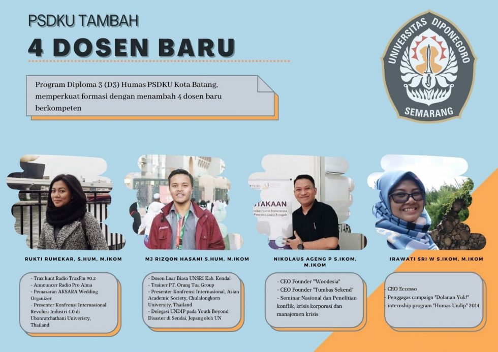 SEMARANG –Universitas Diponegoro (UNDIP) strengthened the 3-Year Diploma Program (D3) of Public Relations Study Program of PSDKU (Outside Main Campus Study Program) Batang by adding four lecturers. The four new lecturers in addition to meeting the required qualifications and competencies, also had experience that was considered to be able to enrich their teaching abilities.