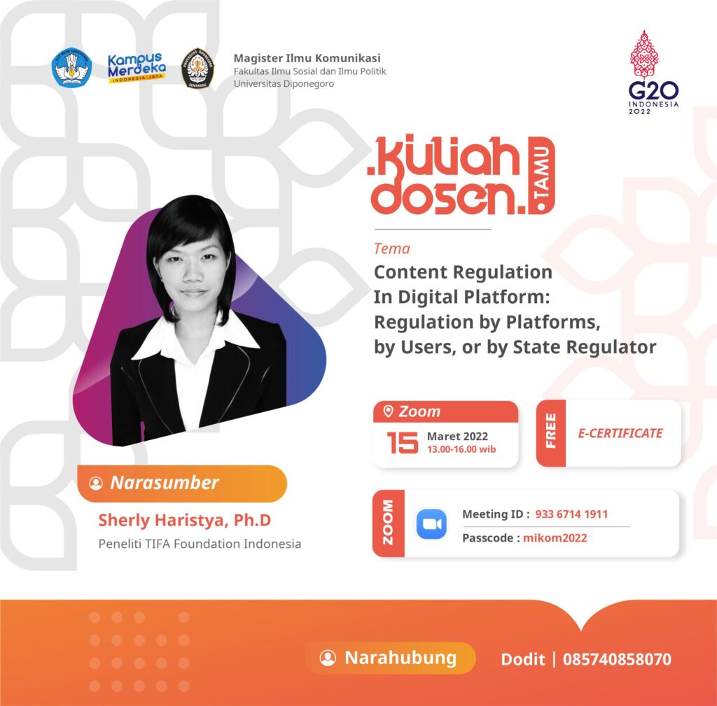 Kuliah Dosen Tamu dengan Tema “Content Regulation In Digital Platform: Regulation by Platforms, by Users, or by State Regulators”