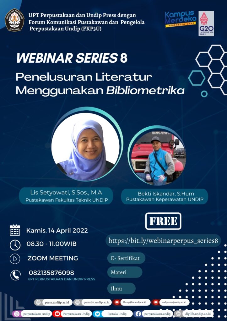 The search for scientific literature is an important thing in the research process. There are many ways to do literature searching. One of the ways that is often forgotten is citation chasing/citation searching. Searching the literature using citation chasing/citation searching makes it easier for a researcher to find relevant literature. Further exploration can be done in citation chasing/citation searching using bibliometric analysis. Learning how to search for literature is expected to help the academic community in the research process. UPT Library and Undip Press along with the Communication Forum for Librarians and Undip Library Managers will hold a webinar.