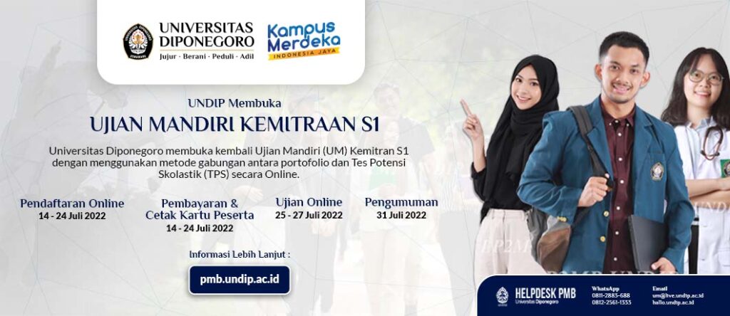 Universitas Diponegoro membuka kesempatan bagi calon mahasiswa baru yang ingin studi lanjut di Undip melalui jalur UM Kemitraan S1. UM Kemitraan S1 menggunakan metode Gabungan antara Portofolio dan Tes Potensi Skolastik (TPS) Secara Online. Persyaratan mengikuti seleksi ini antara lain siswa lulusan SMA/SMK/MA atau yang sederajat, lulus ujian persamaan, atau yang setara lainnya (paket C) […]