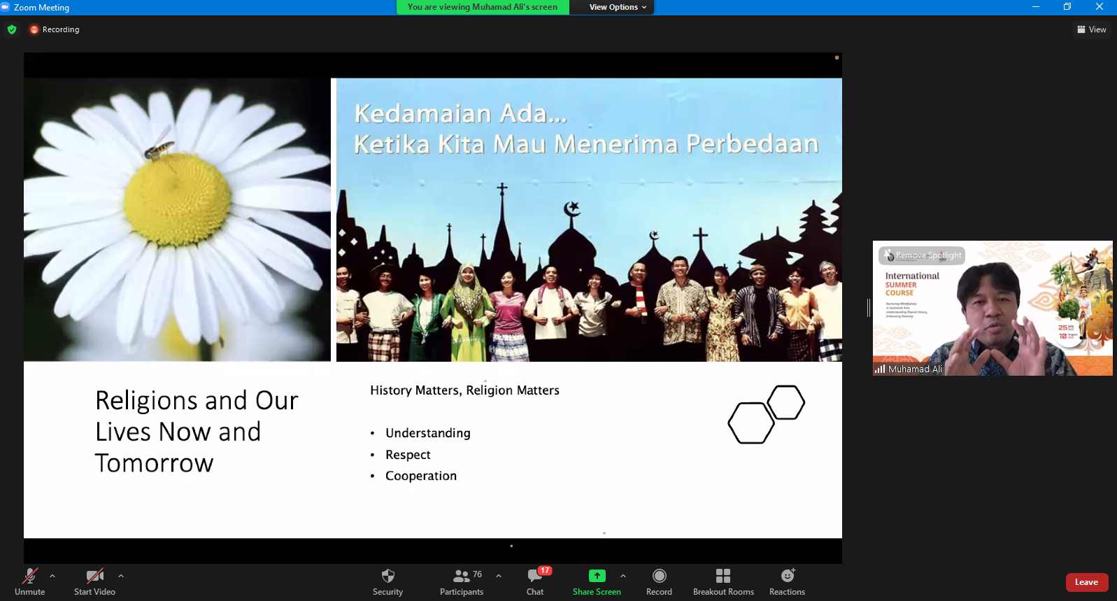 The first session that was held on Tuesday, July 26, 2022, at 11:00 GMT+7 brought the theme of “History of Southeast Asia: Migration, Diaspora, and Spread of Religion”. The event was held online through Zoom apps with 77 participants including local and foreign participants. This session presented a lecturer at Universitas Islam Negeri (UIN) Syarif Hidayatullah Jakarta, Muhammad Ali., P.hD and was moderated by S Rouli Manalu, S.Sos, M.Comm.St., Ph.D., a lecturer at FISIP Undip Communication Science department.
