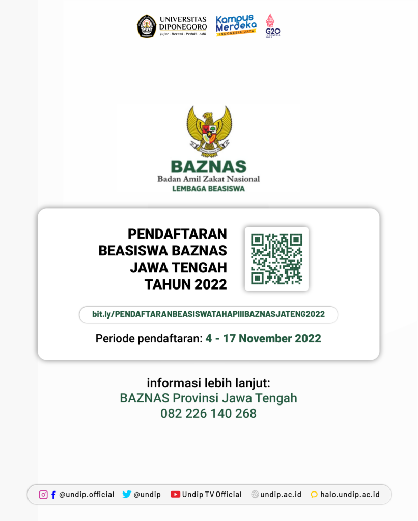 Menindaklanjuti surat dari Ketua Badan Amil Zakat Nasional Provinsi Jawa Tengah Nomor 1401/BAZNAS-Prov/XI/2022 tanggal 3 November 2022 tentang pemberitahuan Beasiswa BAZNAS 2022, berikut kami informasikan ketentuan beasiswa tersebut: Peserta sebagai mahasiswa aktif dan tidak menerima beasiswa dari pihak manapun dibuktikan dengan Surat Keterangan dari Pimpinan Perguruan Tinggi/Fakultas dan fotocopy Kartu Tanda Mahasiswa yang masih berlaku; […]