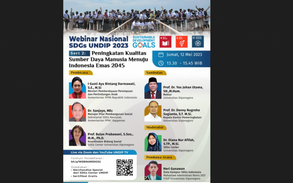 Kantor Pemeringkatan Universitas Diponegoro (Undip) menggelar Webinar Nasional SDGs Undip 2023 Seri 2: Peningkatan Kualitas Sumber Daya Manusia Menuju Indonesia Emas 2045 dalam rangka mendukung pencapaian tujuan pembangunan berkelanjutan (Sustainable Development Goals/SDGs) Goal 4 (Quality Education) dan Goal 5 (Gender Equality). Webinar ini dilaksanakan pada Jumat, 12 Mei 2023 13:30-15:45 WIB secara daring melalui Zoom meeting dan live YouTube. Pembicara yang […]