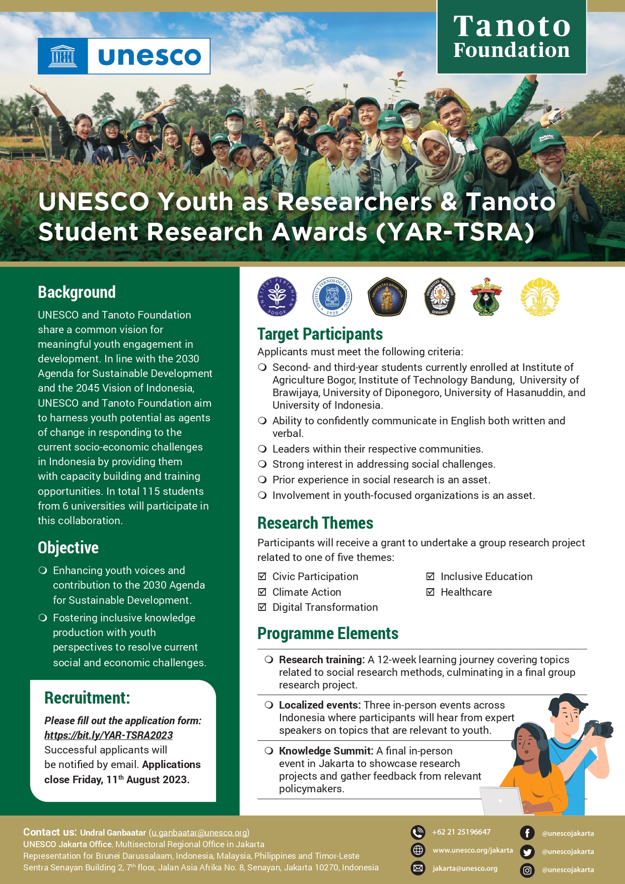 The YAR-TSRA (Youth as Researchers – Tanoto Student Research Awards) is a training and mentoring initiative that provides support for the younger generation to design and conduct social research under the auspices of UNESCO and the Tanoto Foundation. This program encompasses training and guidance in research methodologies, academic writing, critical thinking skills, and problem-solving abilities. The primary objective of this endeavor is to create a space for the youth to voice their opinions and experiences on contemporary issues through the production of inclusive knowledge. The research outcomes produced by the participants will be presented to policymakers and relevant stakeholders, facilitated by both UNESCO and the Tanoto Foundation.