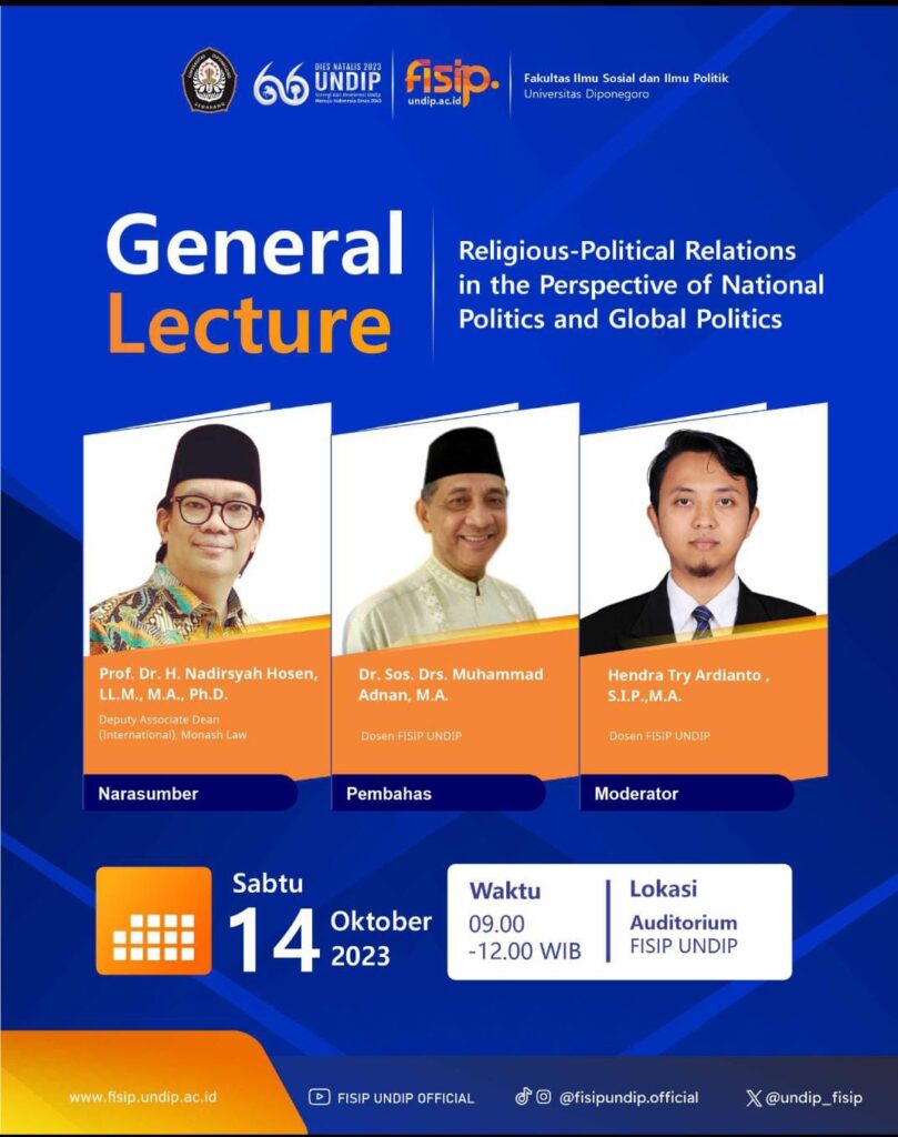 Kuliah Tamu “Relasi Agama-Politik dalam Perspektif Politik Nasional dan Politik Global” yang diselenggarakan oleh Fakultas Ilmu Sosial dan Ilmu Politik Universitas Diponegoro merupakan suatu acara edukatif yang membahas hubungan kompleks antara agama dan politik dalam konteks nasional dan global. Kuliah ini mengulas peran agama dalam politik, tantangan dan dinamika yang muncul dalam interaksi antara keduanya, […]