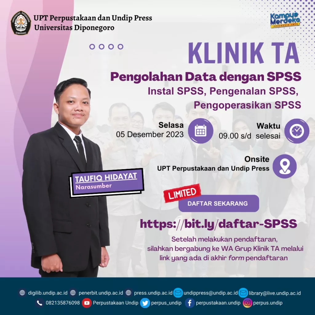 Hai Pusdip, Ayo kita belajar bersama terkait pengolahan data menggunakan SPSS. Kita akan belajar untuk menginstal, mengenal dan mengoperasikan SPSS. Narasumber: Taufiq Hidayat Waktu Pelaksanaan: ???? Selasa, 5 Desember 2023 ???? 09.00 WIB s.d selesai ???? Gedung UPT Perpustakaan Undip Segera daftarkan diri, kuota terbatas Khusus mahasiswa Undip Daftar pada link berikut: https://bit.ly/daftar-SPSS Narahubung +62 […]