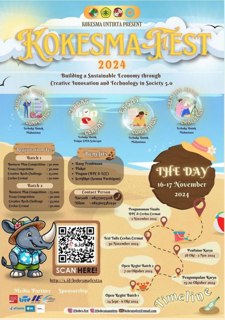Tema: Building a Sustainable Economy through Creative Innovation and Technology in Society 5.0 Waktu Pelaksanaan: Pendaftaran Gelombang 1 : 24 Sept – 6 Okt 2024 Pendaftaran Gelombang 2 : 7 Okt – 20 Okt 2024 Pengumpulan Karya : 15 – 20 Okt 2024 Penilaian Karya : 28 Okt – 2 Nov 2024 The Day Kokesma […]