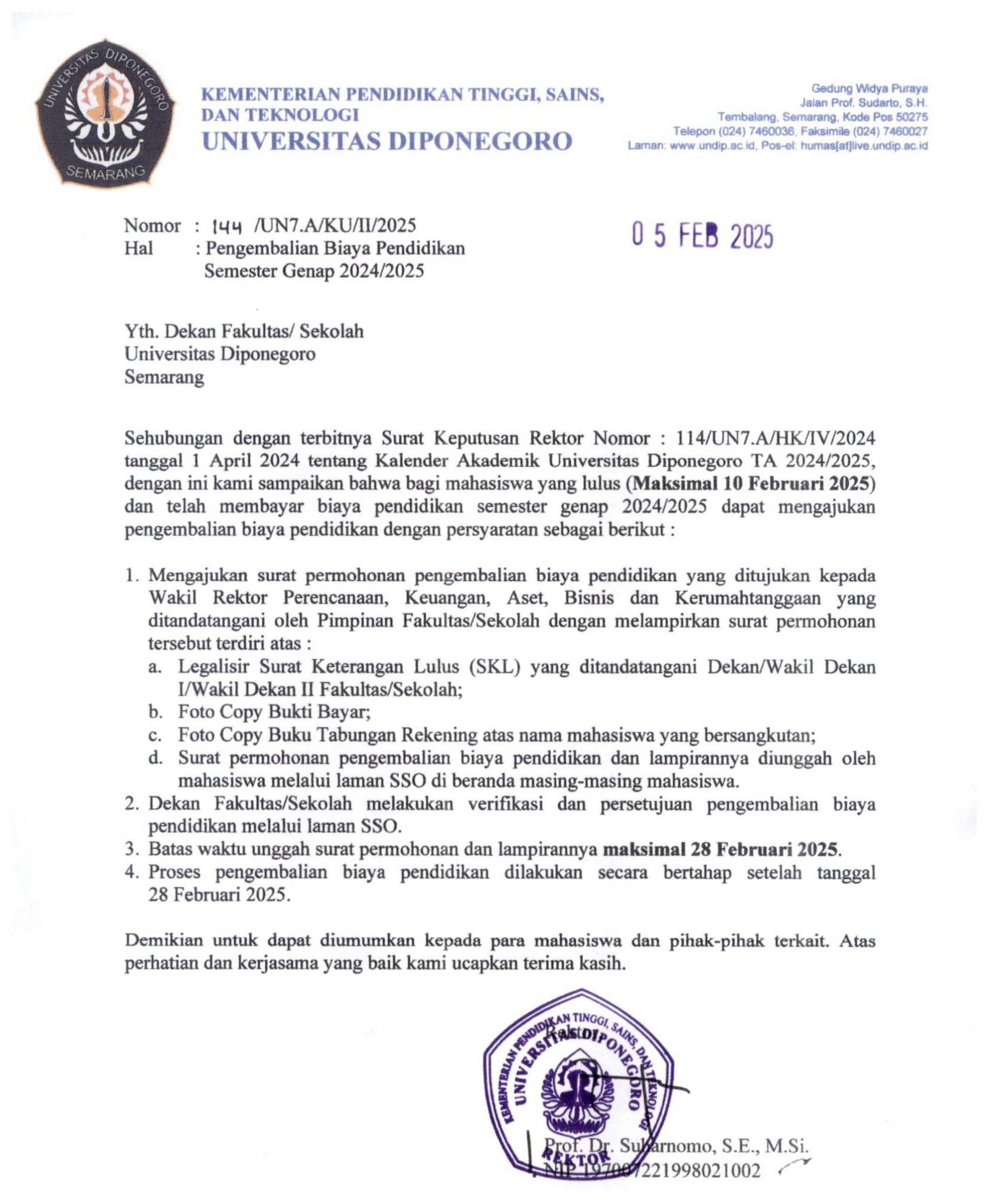 In connection with the issuance of the Rector’s Decision Number: 114/UN7.A/HK/IV/2024 dated April 1, 2024, regarding the Academic Calendar of Diponegoro University for the 2024/2025 Academic Year, we hereby inform that students who graduate (latest by February 10, 2025) and have paid the tuition for the even semester of 2024/2025 can apply for a tuition refund with the following requirements: