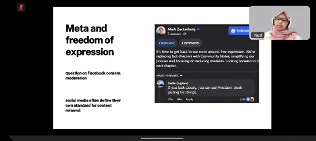 During the lecture, Dr. Nuri began by discussing the current state of social media, particularly in Southeast Asia, and the massive scale of social media usage today. She emphasized the significance of understanding social media as a critical platform for freedom of speech, which is a vital issue in today’s political landscape. She shared various cases related to freedom of speech, raising questions about the role of platforms such as Meta and Facebook in moderating content. Dr. Nuri pointed out how platforms often define their own standards for what can and cannot be shared, challenging the audience to reflect on whether social media environments are shaped by users themselves or dictated by the platforms.