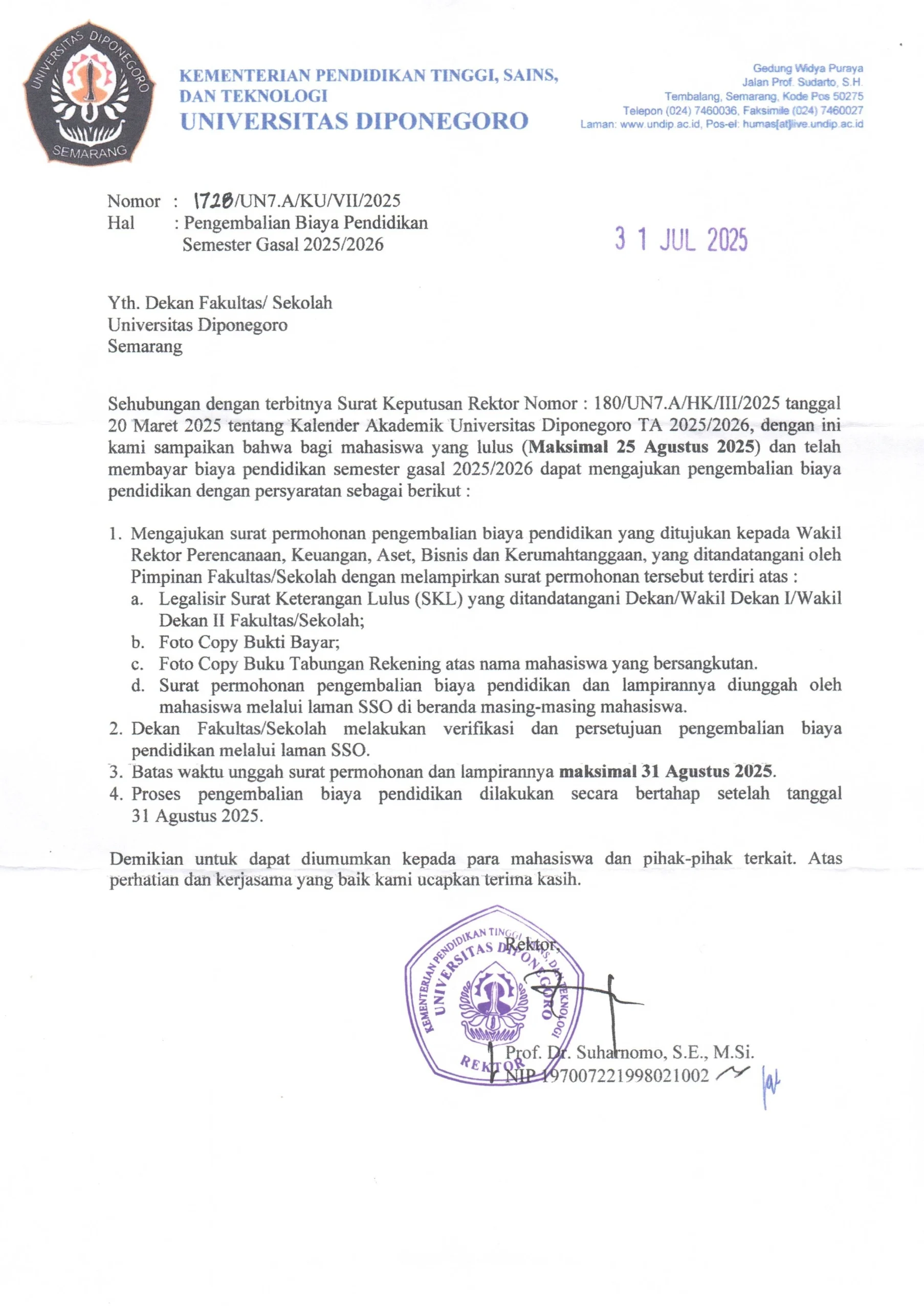 Diponegoro University (Undip) opens the opportunity for students who have graduated by August 25, 2025, and have paid tuition fees for the First Semester 2025/2026 to apply for a fee refund. Applications must be submitted via the SSO system, accompanied by a formal request letter signed by the Faculty/School Head, legalized Graduation Certificate (SKL), a copy of payment proof, and a copy of the student’s bank savings account book in their own name. The deadline for uploading documents is August 31, 2025, and the refund process will be carried out in stages starting after that date.
