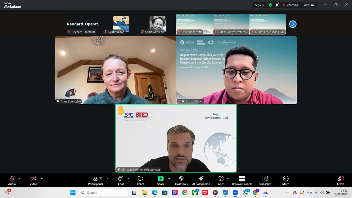 The first session was moderated by Ardy Wibowo, M.BA as the lecturer at the Department of Business Administration Universitas Diponegoro. The session delivered by Dr. Anna Spenceley as the former chair of IUCN WCP TAPAS Group highlighted 3 main transitions of terminology from Sustainable Tourism, Responsible Tourism, to Regenerative Tourism.