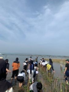 At around 7:00 WIB, the main activity began with the planting of mangrove seedlings. Participants walked to the designated planting location and were directly guided by the farmer group. During this session, Mr. Sururi demonstrated the proper steps for planting mangroves, starting from driving bamboo stakes as supports, making holes in the soil, to planting and tying the mangrove seedlings to ensure they grow firmly. All participants then practiced the instructions together, planting hundreds of mangrove seedlings along the coastline.