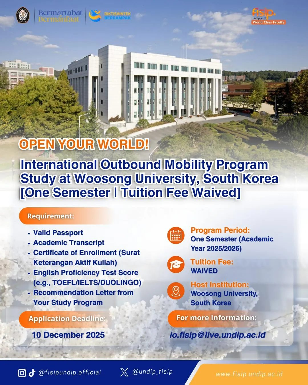 SEMARANG, Indonesia – Fakultas Ilmu Sosial dan Ilmu Politik (FISIP) Universitas Diponegoro (Undip) telah mengumumkan kesempatan menarik bagi mahasiswanya untuk belajar di luar negeri selama satu semester di Woosong University di Korea Selatan dengan pembebasan penuh biaya kuliah.