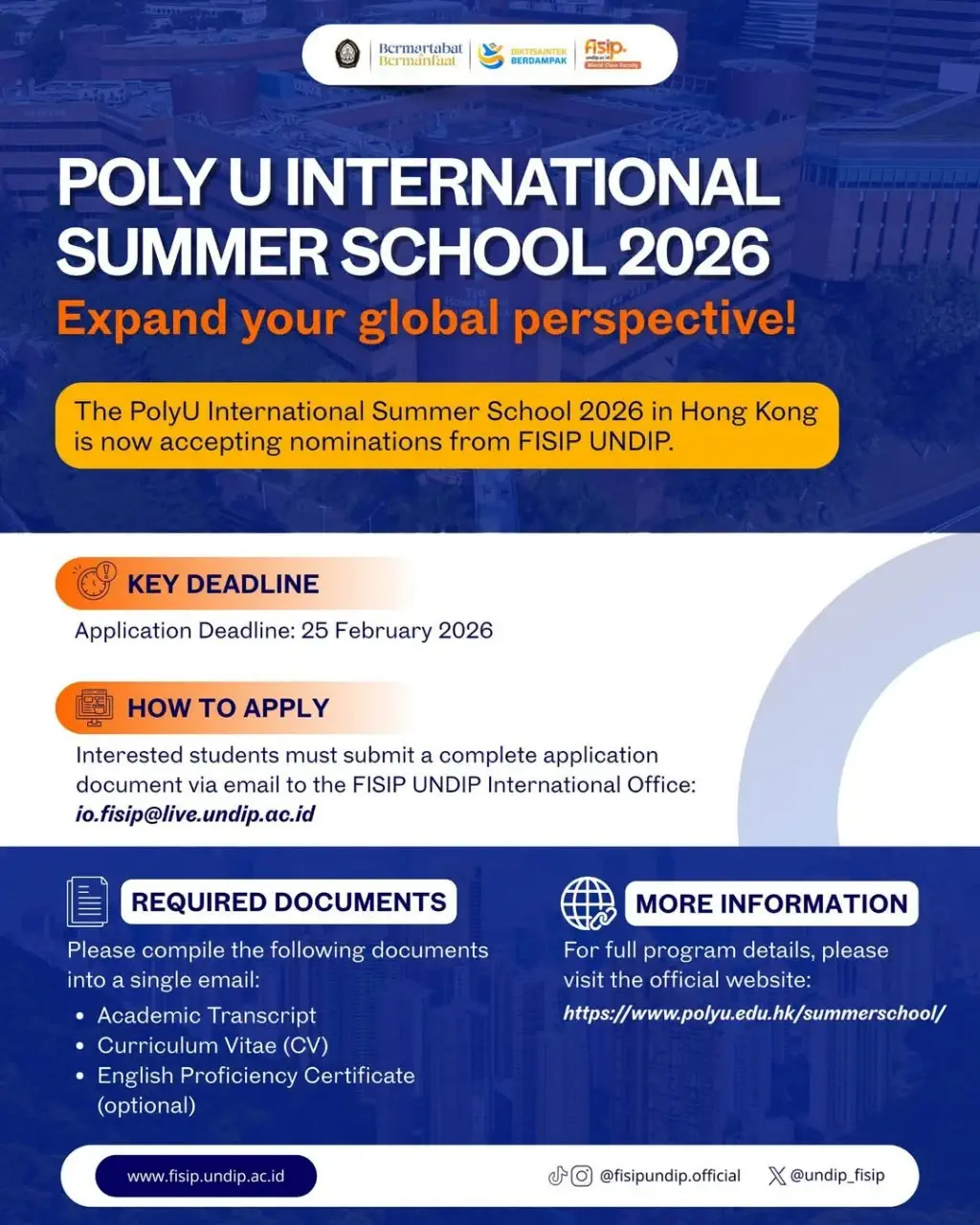 The PolyU International Summer School 2026 in Hong Kong is now accepting nominations from FISIP UNDIP.