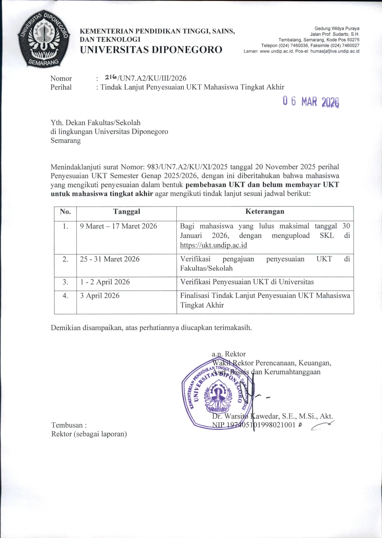 Diponegoro University, through the Vice Rector for Planning, Finance, and Administration, has issued Letter Number: 216/UN7.A2/KU/III/2026 regarding the Follow-up on Tuition Fee (UKT) Adjustment for Final-Year Students, Even Semester 2025/2026.