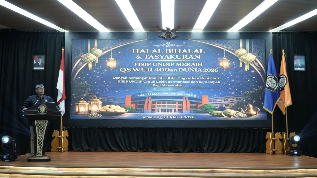 SEMARANG (03/31) – An atmosphere of solidarity and gratitude filled the FIMENA Auditorium on the 3rd floor of Building A, FISIP Undip Tembalang Campus, on Tuesday, March 31, 2026. The Faculty of Social and Political Sciences (FISIP) at Universitas Diponegoro (Undip) hosted the 1447 H Halal Bihalal (post-Ramadan gathering) and Tasyakuran (gratitude celebration) event, marking a significant moment to strengthen silaturahmi (familial bonds) while celebrating a remarkable achievement: its inclusion in the top 400 of the QS World University Rankings (WUR) 2026. The event brought together all lecturers, education staff, members of the Dharma Wanita organization, security and cleaning staff, student representatives from the Student Executive Board (BEM), Student Senate, and other student organizations, international students, as well as retired FISIP Undip faculty members.