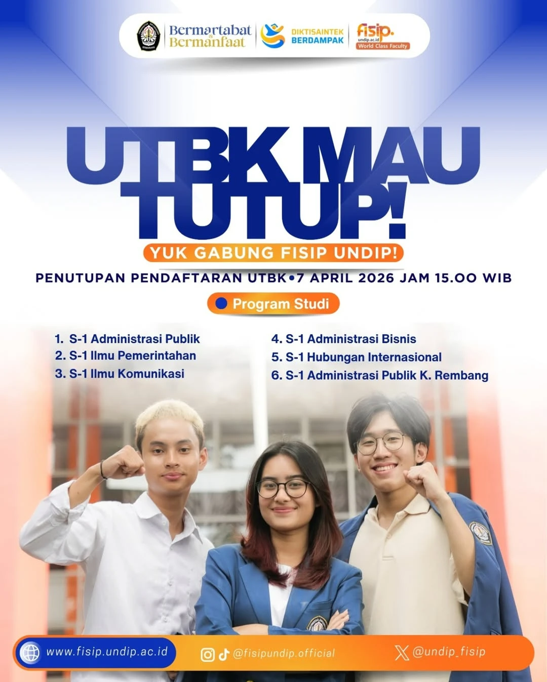Semarang, April 7, 2026 – The Faculty of Social and Political Sciences (FISIP) of Universitas Diponegoro reminds all prospective students that the UTBK (Computer-Based Written Test) registration will close today, Monday, April 7, 2026 at 3:00 PM WIB.