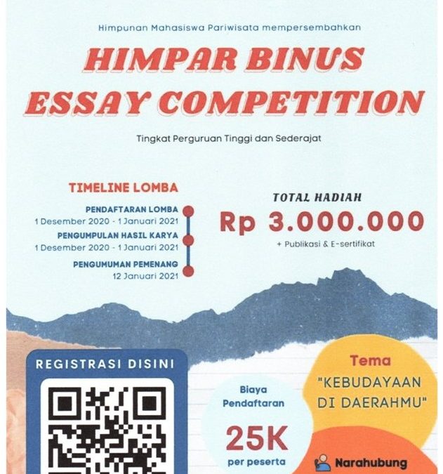 Memperhatikan surat dari Himpunan Mahasiswa Pariwisata Universitas Bina Nusantara (HIMPAR BINUS) Nomor: 15.001/HIMPAR/XI/2020 perihal tersebut pada pokok surat, dengan ini kami beritahukan bahwa Himpunan Mahasiswa Pariwisata Universitas Bina Nusantara akan menyelenggarakan Lomba Menulis Esai Tahun 2021, pendaftaran tanggal 1 Desember 2020 s.d 1 Januari 2021, Informasi lebih lanjut dapat menghubungi panitia pelaksana, Hasna HP. 081958388771, persyaratan, ketentuan lomba dan pendaftaran dapat diunduh disini