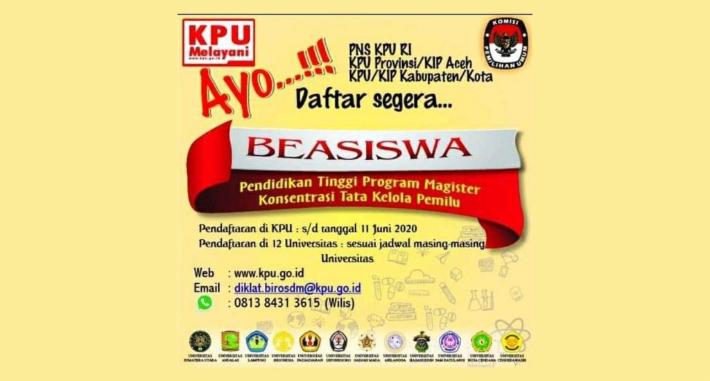 Jakarta, kpu.go.id – KPU kembali membuka kesempatan bagi 50 (lima puluh) orang Pegawai Negeri Sipil Sekretariat Jenderal KPU RI, Sekretariat KPU Provinsi/KIP Aceh, dan Sekretariat KPU/KIP Kabupaten/Kota, untuk memperoleh Beasiswa Pendidikan Tinggi Program Magister Konsentrasi Tata Kelola Pemilu di 12 (dua belas) Perguruan Tinggi Negeri. Persyaratan serta jadwal seleksi tertuang dalam Pengumuman No. 03/SDM.03.1-Pu/05/SJ/III/2020 tentang Beasiswa Pendidikan Tinggi […]