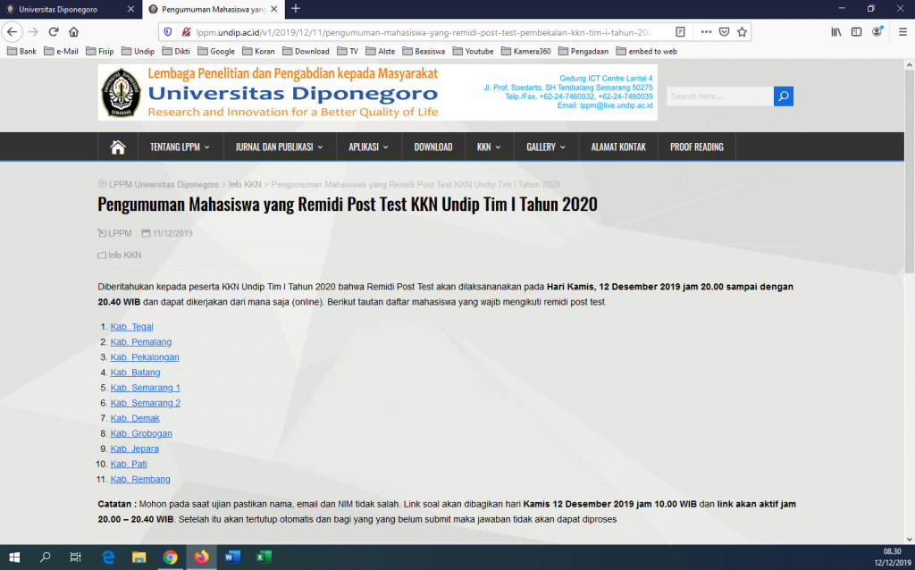 Diberitahukan kepada peserta KKN Undip Tim I Tahun 2020 bahwa Remidi Post Test akan dilaksananakan pada Hari Kamis, 12 Desember 2019 jam 20.00 sampai dengan 20.40 WIB dan dapat dikerjakan dari mana saja (online). Berikut tautan daftar mahasiswa yang wajib mengikuti remidi post test. Kab. Tegal Kab. Pemalang Kab. Pekalongan Kab. Batang Kab. Semarang 1 […]