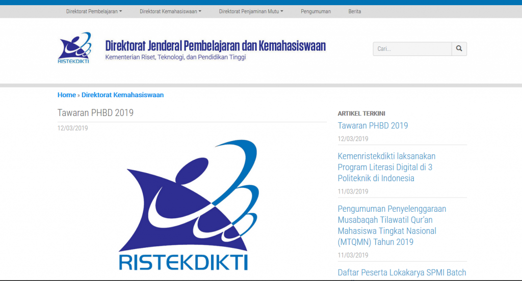 Kepada Yth. Pemimpin Perguruan Tinggi Negeri Bidang Kemahasiswaan Sekretaris Lembaga Layanan Pendidikan Tinggi I s.d. XIV Dalam rangka menumbuhkan rasa peduli mahasiswa untuk berkontribusi kepada masyarakat desa, Direktorat Kemahasiswaan, Direktorat Jenderal Pembelajaran dan Kemahasiswaan, Kemenristekdikti kembali menawarkan ke organisasi kemahasiswaan melalui Unit Kegiatan Mahasiswa (UKM) dan lembaga eksekutif mahasiswa untuk mengikuti Program Hibah Bina Desa […]