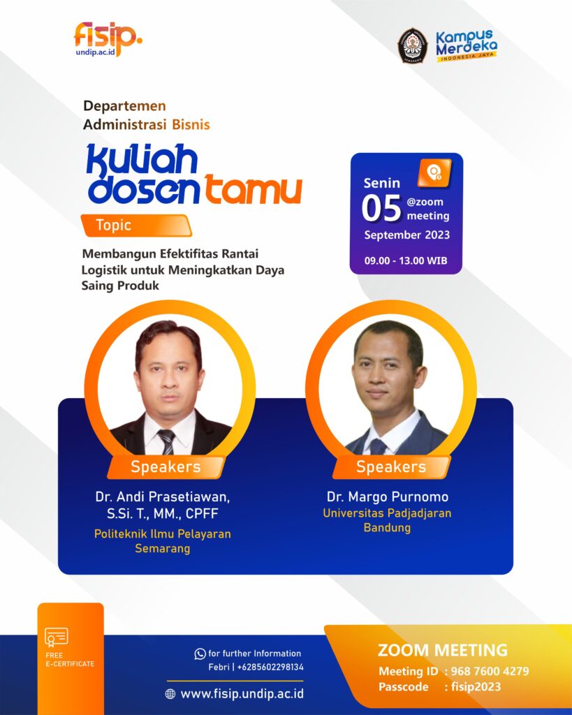 Kuliah Dosen Tamu Departemen Administrasi Bisnis membahas topik “Membangun Efektivitas Rantai Logistik untuk Meningkatkan Daya Saing Produk.” Dalam kuliah ini, peserta akan diperkenalkan pada konsep-konsep kunci dalam rantai logistik dan bagaimana pengelolaan yang efektif dapat berkontribusi pada peningkatan daya saing produk. Dosen tamu yang ahli di bidang ini akan menjelaskan tentang perencanaan, pengendalian, serta koordinasi […]