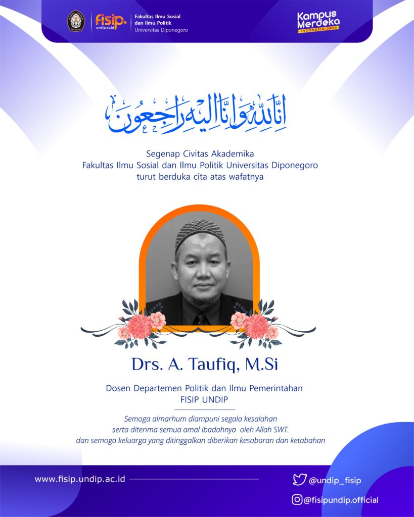 Segenap Civitas Akademika Fakultas Ilmu Sosial dan Ilmu Politik Universitas Diponegoro turut berduka cita atas wafatnya Drs. A. Taufiq, M.Si., Semoga almarhum diampuni segala kesalahan serta diterima semua amal ibadahnya oleh Allah SWT. dan semoga keluarga yang ditinggalkan diberikan kesabaran dan ketabahan.