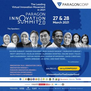 ParagonCorp akan menyelenggarakan Paragon Innovation Summit 2.0 pada 27 & 28 Maret 2021. Kegiatan meliputi: Innovation Talk Innovation Circle Innovation Mindset Paragon Innovation Awards Innovation Showcasing Recruitemen & Internship Speakers: Salman Subakat Nadiem Makarim* Budi Gunadi Sadikin* Nurhayati Subakat Mesty Ariotedjo Najelaa Shihab Alamanda Shantika Raline Shah Tulus Sari Chairunnisa