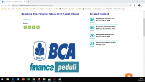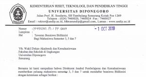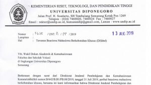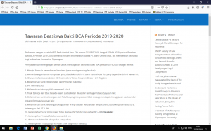 Berkenaan dengan surat dari PT. Bank Central Asia, Tbk nomor 011/CRS/2019, tanggal 23 Mei 2019, perihal Beasiswa Bakti BCA Periode 2019-2020, bersama ini kami informasikan bahwa PT. Bank Central Asia, Tbk memberikan beasiswa bagi mahasiswa Universitas Diponegoro. Persyaratan dan kelengkapan berkas untuk mendapatkan Beasiswa Bakti BCA periode 2019-2020 sebagai berikut