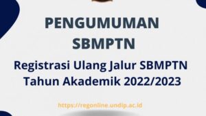 Selamat bagi Calon Mahasiswa baru Program Sarjana Jalur Seleksi Bersama Masuk Perguruan Tinggi Negeri (SBMPTN) Tahun Akademik 2022/2023 di Universitas Diponegoro. Registrasi ulang sesuai rangkaian dalam informasi berikut : PENGUMUMAN REGISTRASI DAN VERIFIKASI SBMPTN TA 2022/2023 (registrasi online mulai tanggal 24 Juni s.d. 29 Juni 2022 pada laman https://regonline.undip.ac.id/) Registrasi online dimulai 24 Juni 2022