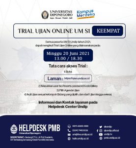TATA CARA UJIAN MANDIRI PASCASARJA & PROFESI TA 2021/2022 1. Peserta membuka media Zoom dengan ID meeting sesuai yang tertera pada kartu peserta. 2. Peserta membuka laman https://ujian.undip.ac.id 3. Masukkan username : Nomor Peserta dan password : Kode Billkey 4. Pilih menu agenda ujian, untuk Tes Potensi Akademik (Pukul 08.00