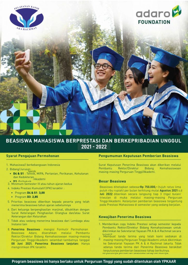 Hereby we convey that the 2021/2022 Pelayanan Kasih A&A Rachmat Foundation will give scholarship to UNDIP’s students. The requirements for the new application to get the scholarship as follows : Students of Undergraduate, a 4-year Diploma and a 3-year Diploma program from Department/Study Program : Engineer, Medical, Science and Mathematics, Agriculture and Fisheries Minimum GPA for […]